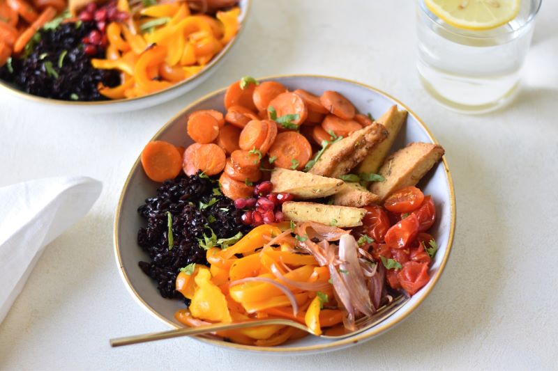 It takes just 10 minutes to prep and 15 minutes to roast this easy and flavorful dinner. The tofu is flash-marinated in a Greek souvlaki-style marinade of lemon juice, olive oil and oregano and comes out crispy on the outside, while the vegetables are perfectly tender. Feel free to incorporate any veggies you have on hand, keeping in mind that how you chop them will make all the difference in cook time. To coax heartier fall vegetables to cook more quickly in just 15 minutes, simply chop them smaller. Also, experiment with spices in your cupboard! It’s all meant to be easy, economical and nutritious. The light Mediterranean seasonings coupled with oven roasting coaxes out the deepest flavor in any veggie you choose.