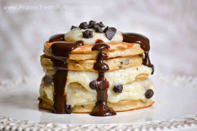 - In a blender or food processor, combine all fluff ingredients and blend until completely smooth. Spread cookie dough fluff on top of each pancake, creating a tower of pancakes if you’d like.
