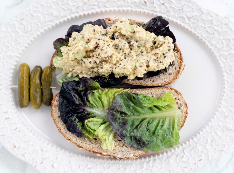 Meet your new favorite lunch! Combining chickpeas and tofu, this vegan “egg” salad mimics the look and texture of the classic kind, with tofu resembling egg whites and chickpeas for yokes. But this plant-based version boasts more protein than eggs with zero cholesterol. Mixed with bold flavors from a few additional whole-food ingredients, it makes for a delicious sandwich or wrap, salad topper or spread for crackers. Taking just 15 minutes from start to finish, it qualifies as quick and easy, but it’s also highly evolved, nutritious and satisfying – perfect qualities for a perfect lunch.