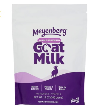 Goat milk benefits: If you’re struggling to consume enough calcium, consider adding goat’s milk to your diet. Meyenberg Whole Powdered Goat Milk offers 300 mg of calcium (25% of your daily value) per serving.