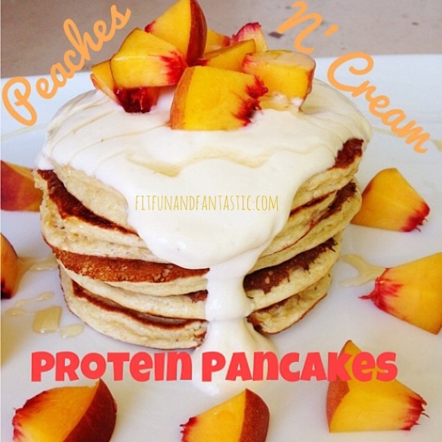 - Satisfying breakfast: They may sound decadent, but these Peaches ‘n Cream Protein Pancakes are powered by healthy oats, protein powder, low-fat yogurt and a perfectly sweet peach topping!