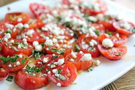 Casseroles, coleslaws, brimming bowls of sherbet punch—the potluck table will be full of tasty homemade creations, but none will be as elegant or eye catching as yours when you make these tomato-feta slices. As a finger-food appetizer or fancy side dish served with a fork, crumbly, tart cheese and fresh tomato line up for a gourmet upgrade in this quick-and-easy recipe, perfect for parties, picnics or using up your garden’s summer tomato harvest.