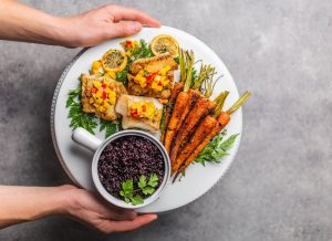 Fresh Fish with Black Rice & Lemon-Thyme Roasted Carrots